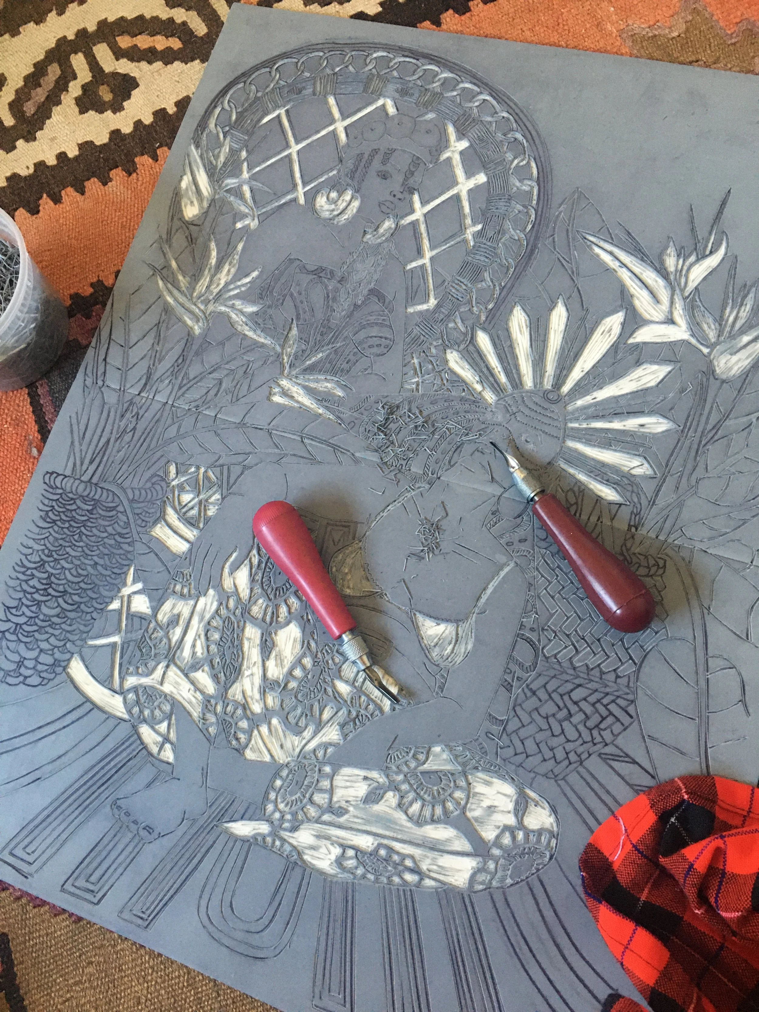 For Chantal, the process begins with an original sketch that she wants to turn into a print. She redraws her sketch either directly on the linoleum block/piece of wood or traces her drawing on the surface of the block. Using a selection of gouges, she then carves out the areas where she does not want ink, leaving the uncarved areas as the parts that will be printed (the image carved on the block serves as a mirror image of what will be impressed on to paper).